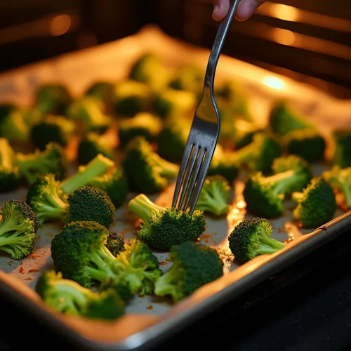 Enfournez pendant 15 à 20 minutes, en surveillant la cuisson pour que le brocoli reste croquant tout en devenant tendre. Vous pouvez tester la cuisson en insérant une fourchette dans les têtes de brocoli : si elle glisse facilement, c'est prêt.